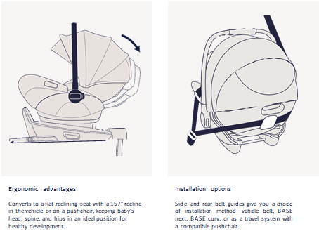 • Te verstellen naar een vlakke autostoel - hoek van 157 ° - te gebruiken in de auto of op een kinderwagen