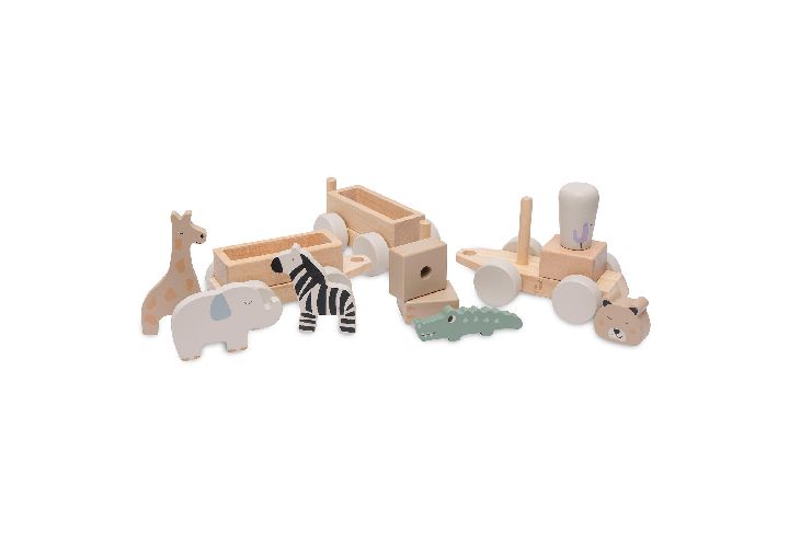 | Inhoud: | 3-delige houten trein met 5 jungle dieren en 4 blokken |
