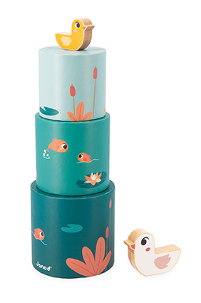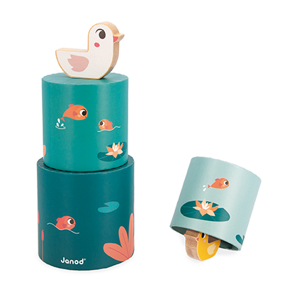 • De tweede is een driedelige ronde piramide met vijverthema en 2 houten eendfiguurtjes: ideaal om de fijne motoriek te stimuleren en de interactie met de baby aan te moedigen!