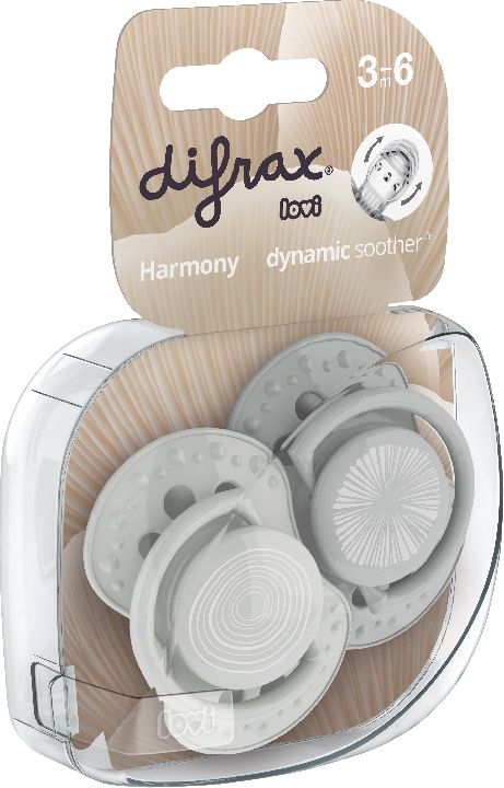 Harmony is een collectie die verwijst naar de trends zoals minimalisme, rust en verbondenheid met de natuur. Het zuiggedeelte van de fopspeen is dynamisch en is opgebouwd uit meerdere siliconenlagen van verschillende diktes. Dankzij deze lagen beweegt de top van het zuiggedeelte mee met het natuurlijke zuigritme.