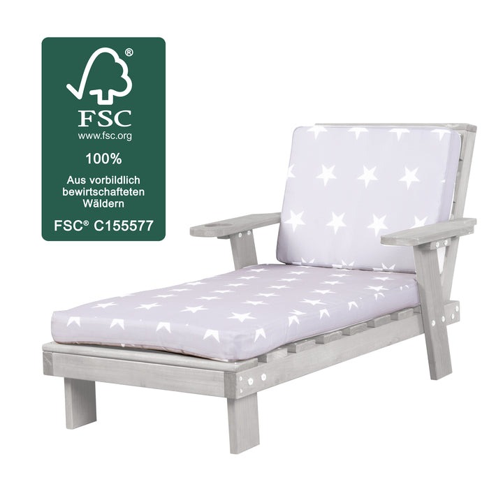 De roba kinderligstoel in het charmante design "Little Stars" combineert stijl en comfort. Ideaal voor gebruik in de tuin, op het terras of tijdens kampeertrips. Het biedt ontspanning in elke omgeving. De tweedelige kussens, gemaakt van wasbaar polyesterweefsel met zachte schuimvulling, garanderen optimaal zitcomfort. Indien nodig zijn de hoezen van de meegeleverde kussenset afneembaar en milieuvriendelijk: machinewasbaar op 40 graden. Deze kinderloungestoel is niet alleen stijlvol, maar ook duurzaam ontworpen. Gemaakt van FSC-gecertificeerd massief hout, wat de hoogste kwaliteit en duurzaamheid garandeert. De stevige constructie, speciaal ontworpen voor peuters, zorgt voor veiligheid en weerbestendigheid. Praktisch is dat de loungestoel is voorzien van een geïntegreerde bekerhouder (diameter van de holte: 6 cm) en twee verhoogde armleuningen voor extra veiligheid en comfort. De roba tuinligstoel is geschikt voor kinderen vanaf 18 maanden en biedt met afmetingen van 54 x 55 x 85 cm (HxBxD) en een zithoogte van 23 cm het perfecte zitje voor kleine avonturiers. De hoogte van de rugleuning met kussen bedraagt ?34 ?cm, het totale ligoppervlak bedraagt ?74 cm. Geniet samen met uw kinderen van ontspannende momenten in de buitenlucht - de roba tuinligstoel in grijs geglazuurd nodigt u uit om te blijven zitten!