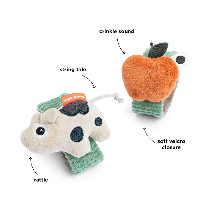 Schattige Polsrammelaar Dotti Green 2 stuks van Done by Deer. Een leuke uitdaging voor je kleintje. Doe de rammelaar om de pols van je baby en luister naar alle geluidjes van de koe en de appel. Bekijk de gehele Tiny Farm collectie.