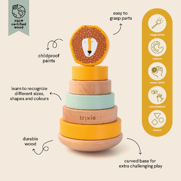 Met zijn mooie balans tussen hout en kleur is deze klassieker in de houten speelgoedlijn een absolute must-have! De houten basis wiebelt, wat een extra uitdaging vormt tijdens het stapelen! Deze stapelaar verbetert de hand-oog coördinatie en stimuleert de fijne motoriek, terwijl kinderen spelenderwijs verschillende vormen en kleuren leren herkennen. Dit product is gemaakt van hoogwaardig 100% FSC ® gecertificeerd beukenhout. Alle verven zijn op waterbasis en veilig voor baby's. Verkrijgbaar in verschillende dieren.