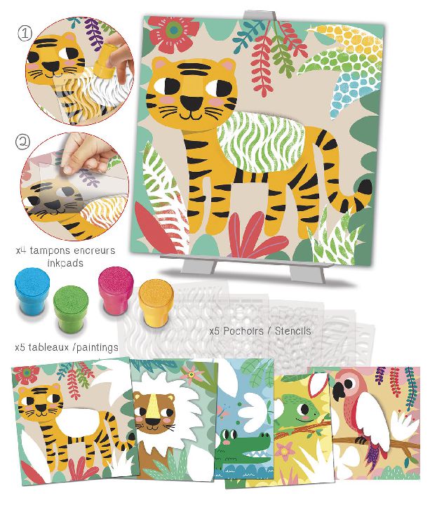 | Inhoud: | 5 kaarten (tijger, leeuw, krokodil, papegaai en kameleon), 5 stencils, 4 stempelkussens, 1 schildersezel |